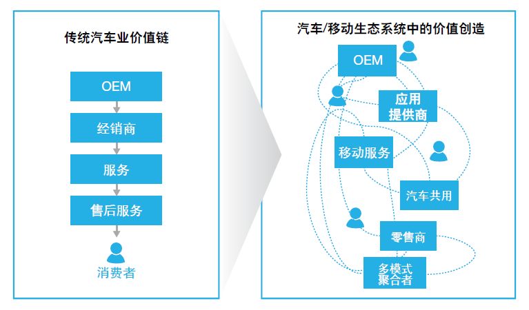 在新型的汽車/移動(dòng)生態(tài)系統(tǒng)中,價(jià)值將與消費(fèi)者從整個(gè)移動(dòng)體驗(yàn)和相關(guān)服務(wù)中獲得的效用掛鉤,而不是來自作為交通工具的汽車本身固有的價(jià)值。價(jià)值的創(chuàng)造反映了整個(gè)客戶體驗(yàn)的質(zhì)量,客戶體驗(yàn)越好,創(chuàng)造的價(jià)值就越多。