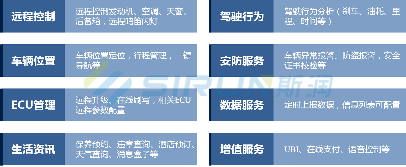 T-Box 作為無(wú)線網(wǎng)關(guān)為整車提供遠(yuǎn)程通訊接口,可以提供行車數(shù)據(jù)采集、行駛軌跡記錄、車輛故障監(jiān)控、車輛遠(yuǎn)程控制(開閉鎖、空調(diào)控制、車窗控制、發(fā)送機(jī)扭矩限制、發(fā)動(dòng)機(jī)啟停)、駕駛行為分析、4G 無(wú)線熱點(diǎn)分享等服務(wù)。