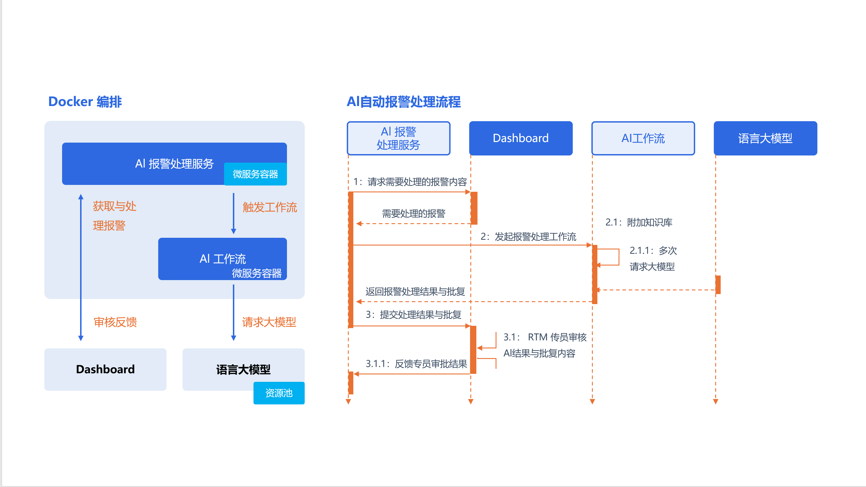 所有服務(wù)均部署于內(nèi)網(wǎng)環(huán)境,確保數(shù)據(jù)安全邊界。報警數(shù)據(jù)采集、AI處理與審核反饋全流程在內(nèi)網(wǎng)閉環(huán)流轉(zhuǎn),保障業(yè)務(wù)數(shù)據(jù)不外泄。AI能力依托主機廠提供的指定參數(shù)量與API規(guī)格的大語言模型,以微服務(wù)容器化方式驅(qū)動智能報警分析與決策。POC階段聚焦核心流程驗證,暫不引入知識庫構(gòu)建,通過定義清晰的AI工作流與大模型交互機制,實現(xiàn)從報警觸發(fā)到審核批復(fù)的自動化處理閉環(huán)。