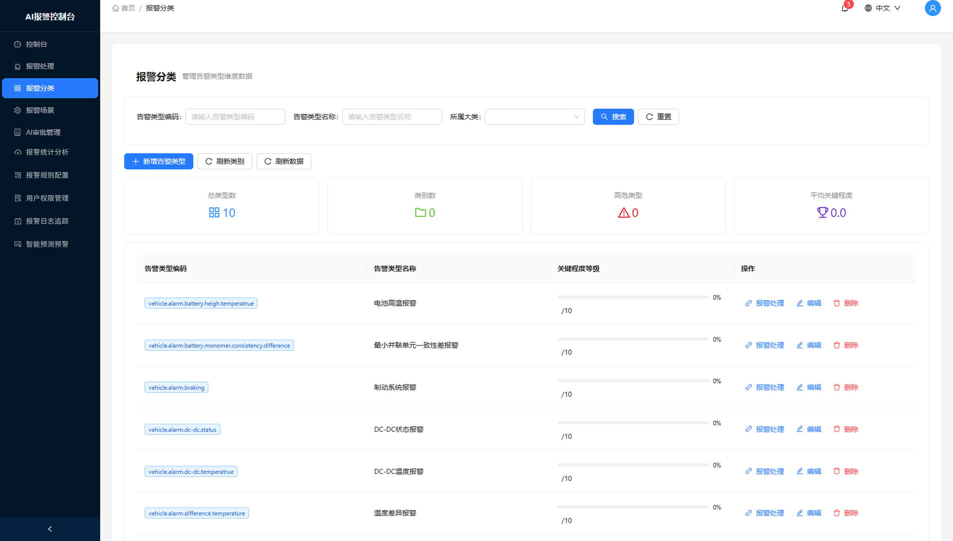 用于維護告警類型維度數(shù)據(jù),支持按關(guān)鍵字段搜索與新增類型,同時展示分類統(tǒng)計看板,方便對各類告警進(jìn)行統(tǒng)一配置與管理。