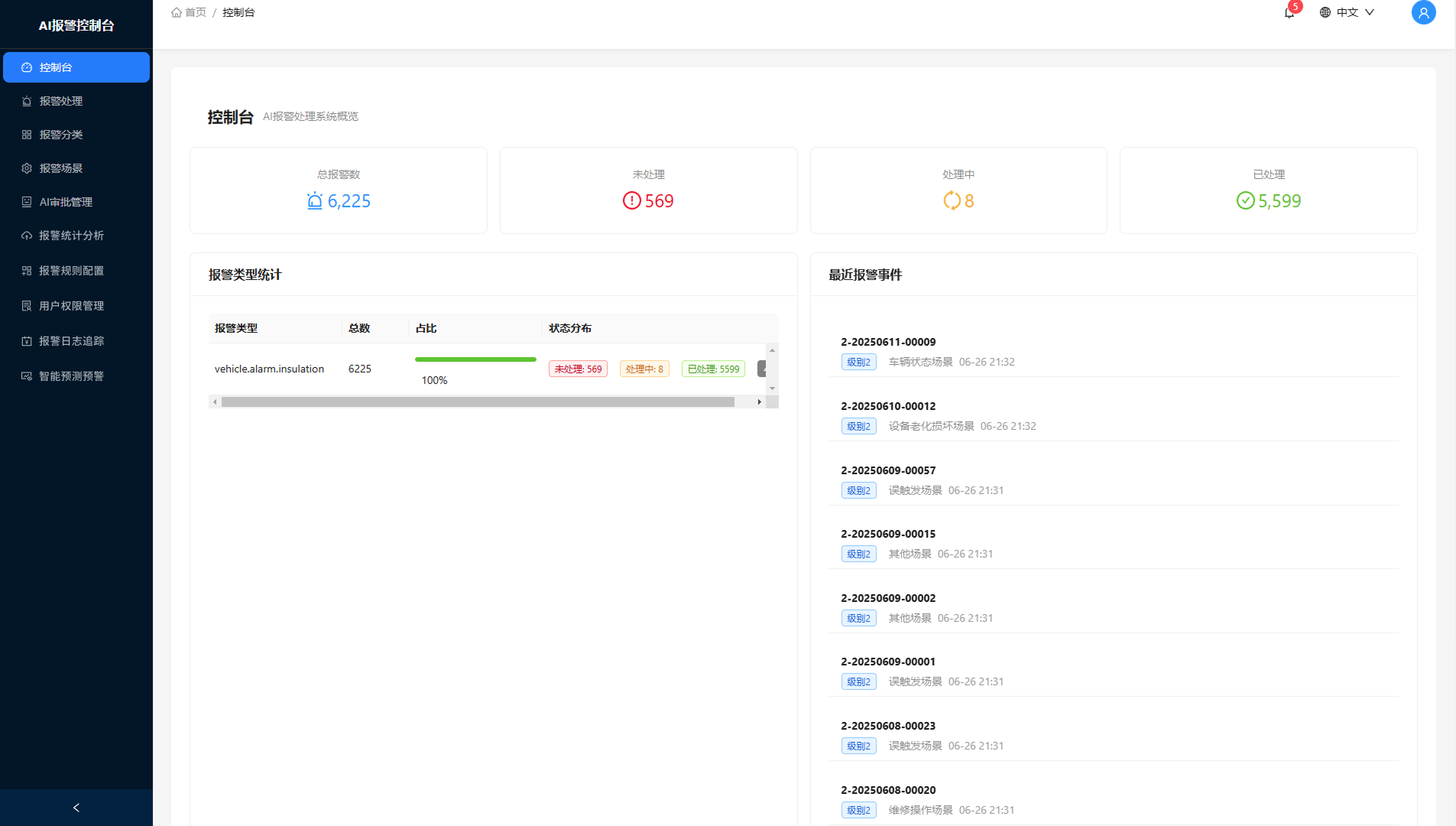 集中展示核心報警數(shù)據(jù)概覽與統(tǒng)計,實時呈現(xiàn)未處理、處理中及已處理報警數(shù)量、類型分布與最新事件列表,為全局監(jiān)控與決策提供直觀數(shù)據(jù)支撐。